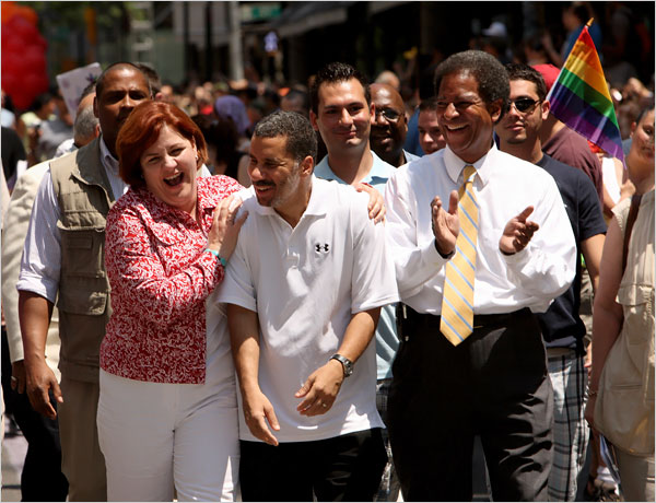 この写真で知事(中央)の向かって左隣で知事の肩を抱いている女性は再びクリスティン・クイン市会議長です。フローレントの写真にも登場していますね。同じ服を来ているので、当日朝はフローレントに行き、そのままプライドマーチに参加したんでしょう。彼女はブルームバーグ市長の任期が切れる次期選挙ではきっと市長候補として立候補すると見られています。